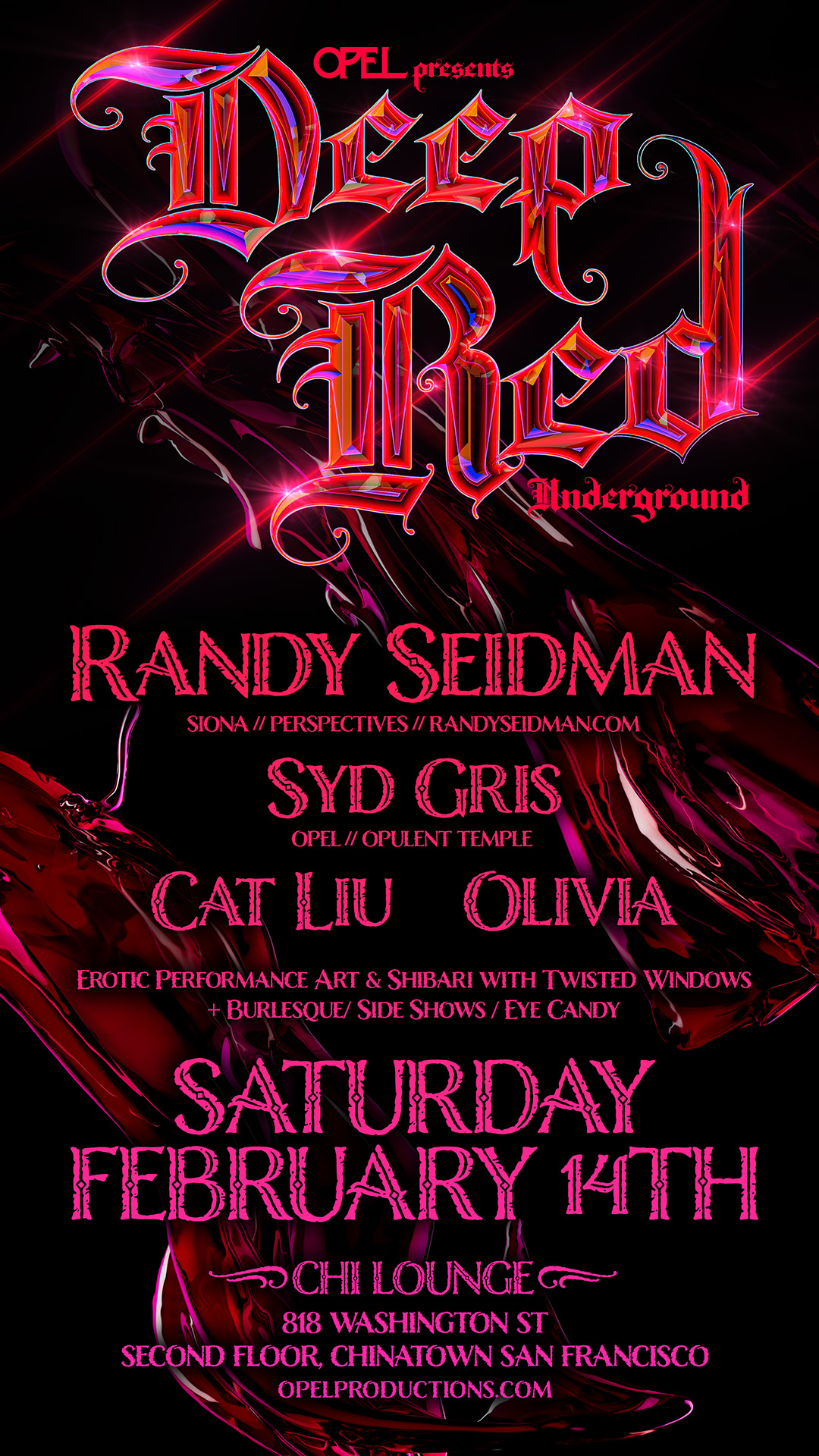 It’s different by design, where SF’s underground bondage, shibari artists & eros tinged performance artists meet the burning dance music underground, ala’ Opel’s community. A Deep, Groovy and Sexy House vibe with a premium on playful, sultry infectious music, with a safe party environment for all to be their most colorful, hot, flirtatious and free, while keeping it classy. Still may be the best Valentine’s date option there is. �