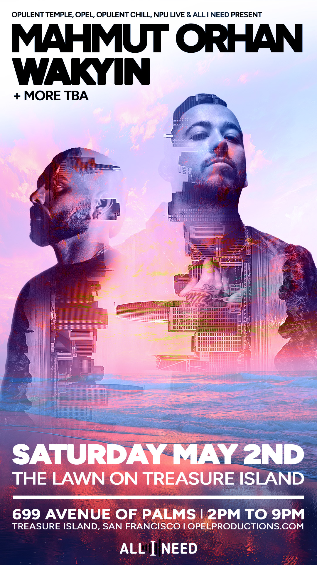Saturday May 2nd - 2PM to 9PM OPEL, OPULENT TEMPLE, OPULENT CHILL & NPU LIVE presents A Special Day into Dusk Party on the Lawn on Treasure Island, with stunning city views of the Bay and the City, the OT Stage Production, Chill spaces, Bars, Food & More Planned! with Mahmut Orhan, Waykin and Syd Gris. 699 Avenue of the Palms, Treasure Island, San Francisco